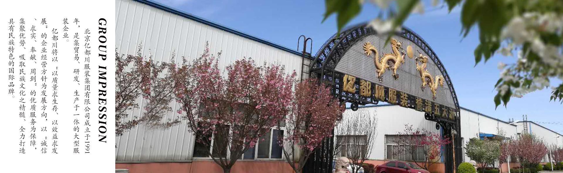 北京亿都川服装集团有限公司是一家集服装设计、研发、生产、销售等多种经营方式于一体的大型民营企业。公司创建于1991年,1997年改制完成,总部位于北京市顺义区马坡聚源工业基地,注册资金15600万元。