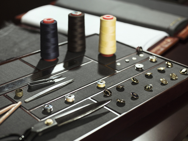 毛衬的工艺、精细打磨的牛角扣、手工缝制的驳头和扣眼等无一不彰显着高级定制应有的水准。